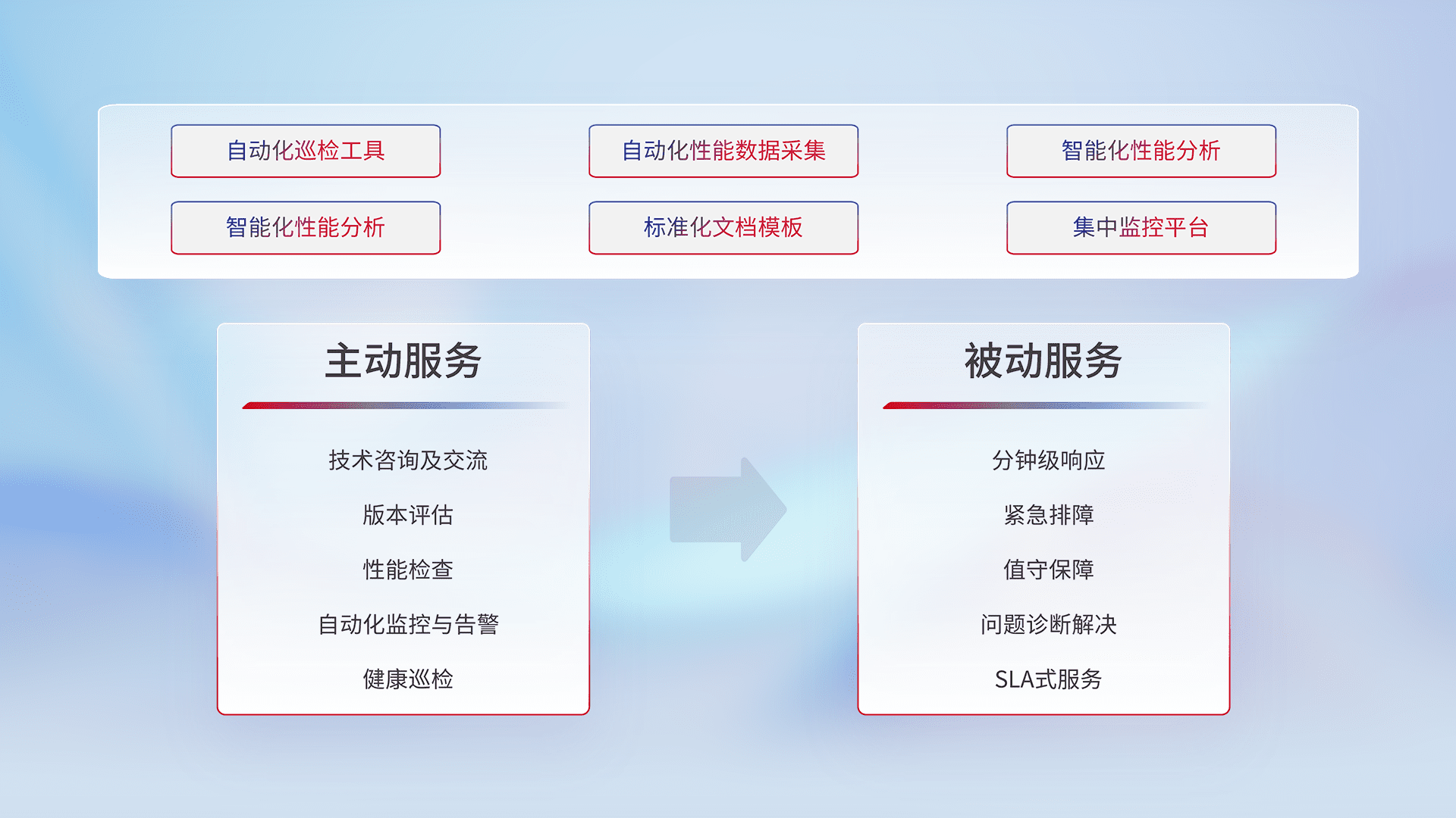 智能化工具和标准化文档,,,保障服务质量,,,,提供主动服务(包含技术咨询、、版本评估、、性能检查、、自动化监控与告警、、、健康巡检)和被动服务包含(分钟级响应、、紧急排障、、、值守保障、、、、问题诊断解决、、SLA服务)。。。