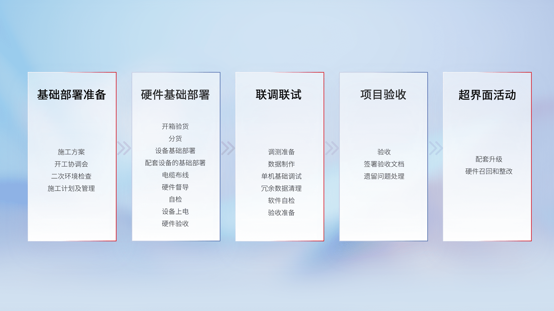从基础部署准备、、、、硬件基础部署、、、、联调联试、、、项目验收、、、、越界面活动的全过程可追溯,,,,保证施工质量和进度。。。